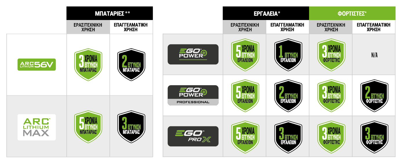 Στην EGO είμαστε υπερήφανοι για την κατασκευή προϊόντων που όχι μόνο έχουν ισχύ που ταιριάζει με τη βενζίνη, αλλά είναι επίσης αξιόπιστα και στιβαρά. Γι' αυτό όλα τα προϊόντα μας καλύπτονται από εκτεταμένες εγγυήσεις στις οποίες μπορείτε να βασιστείτε.
